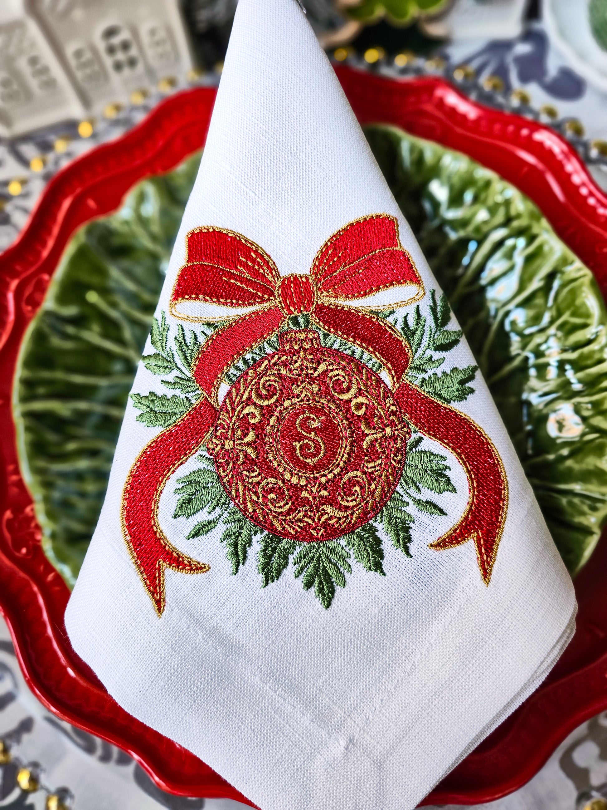 A richly detailed ornament hangs amid evergreen sprigs, finished with a sweeping red bow and glints of metallic gold. The baroque scrollwork feels luxe and heirloom-worthy, perfect for festive winter tables. Stitched on crisp linen, it’s beautiful as-is or with a personalized monogram at the center. An elegant choice for holiday dinners, Christmas brunches, and seasonal soirées.