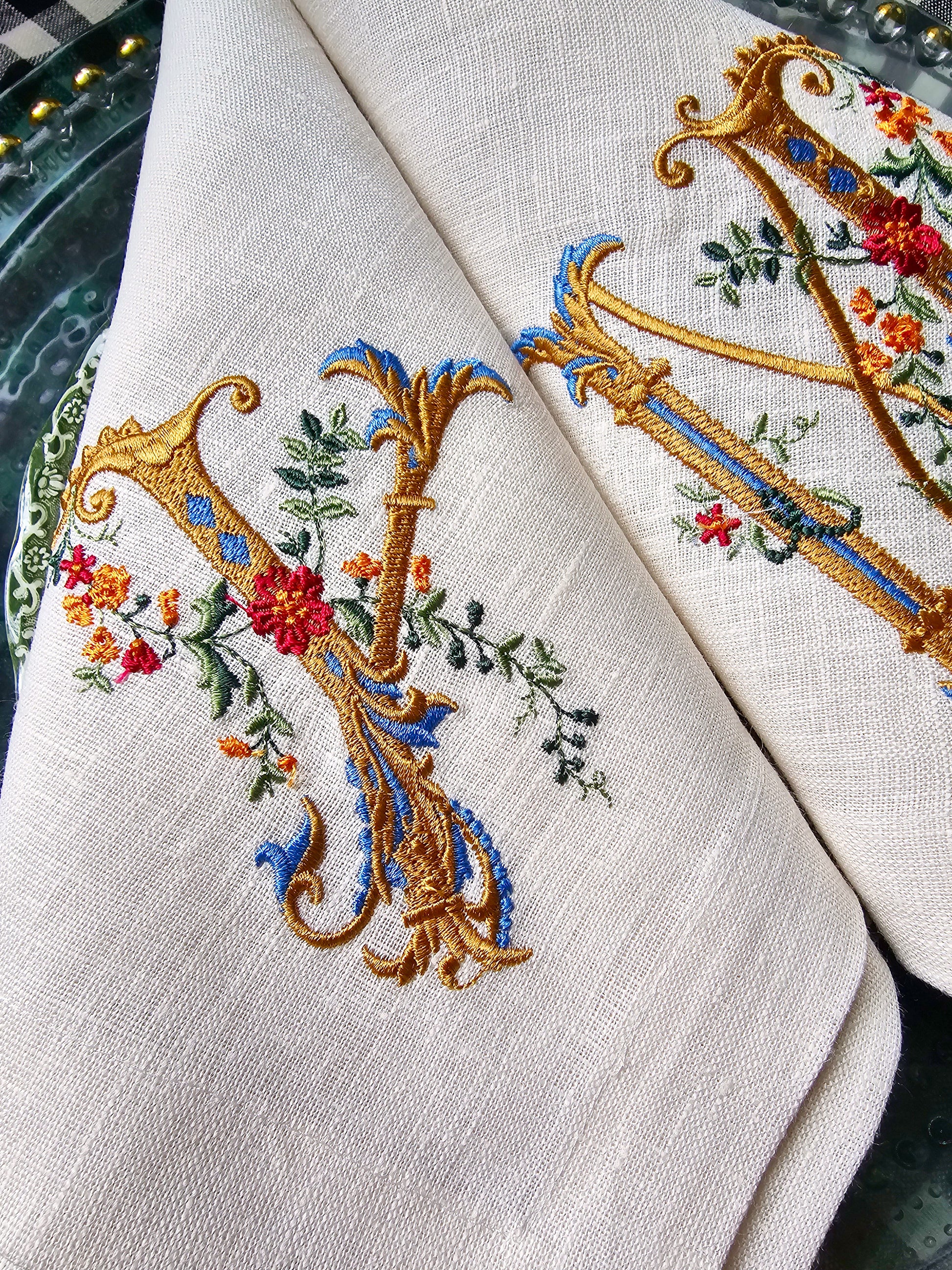 Bring heirloom elegance to your table with this richly embroidered monogram napkin. A regal, baroque-style initial is stitched in shimmering gold with delicate botanical vines, tiny blossoms, and vivid blue accents — designed to feel like vintage stationery brought to life in thread.