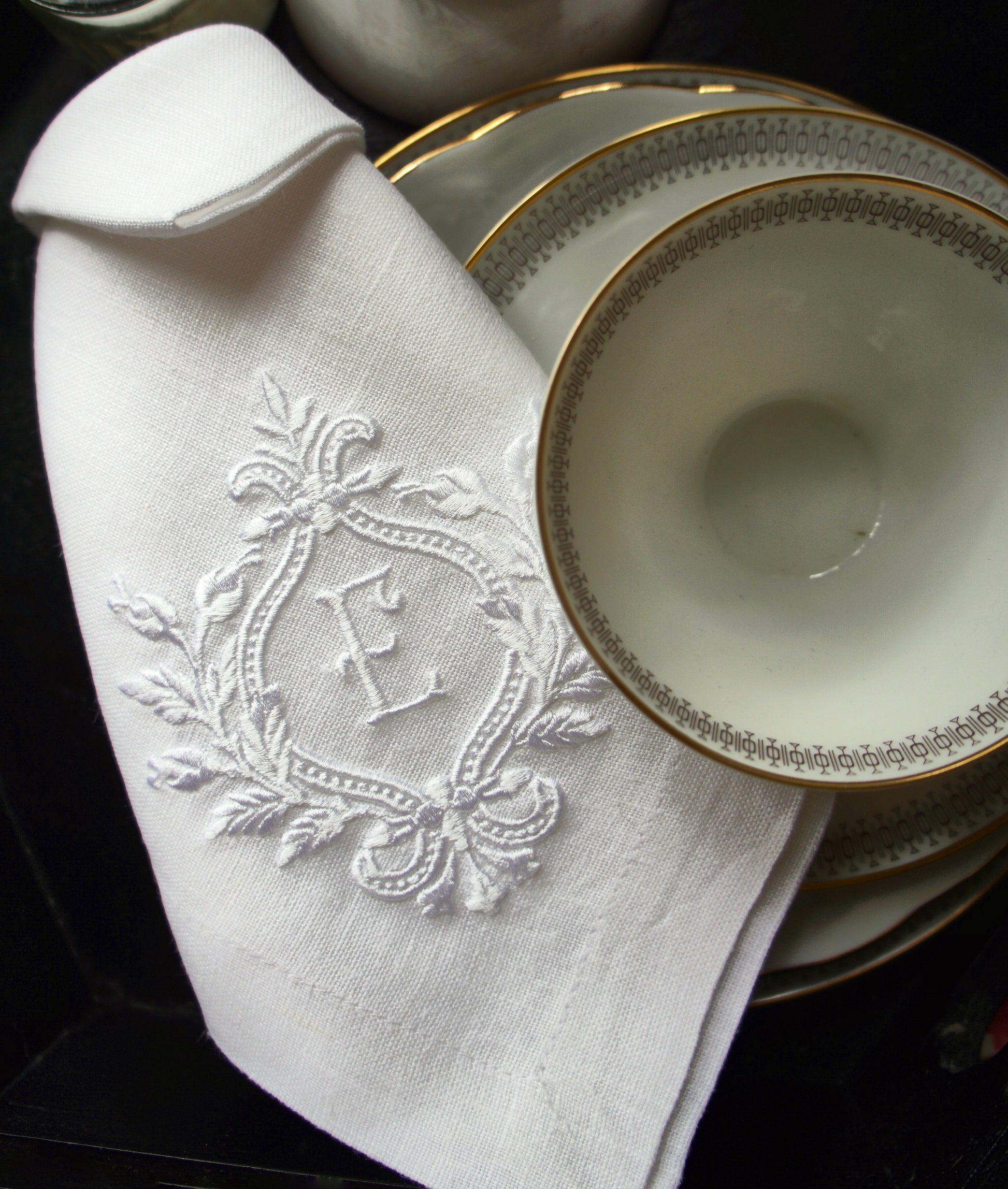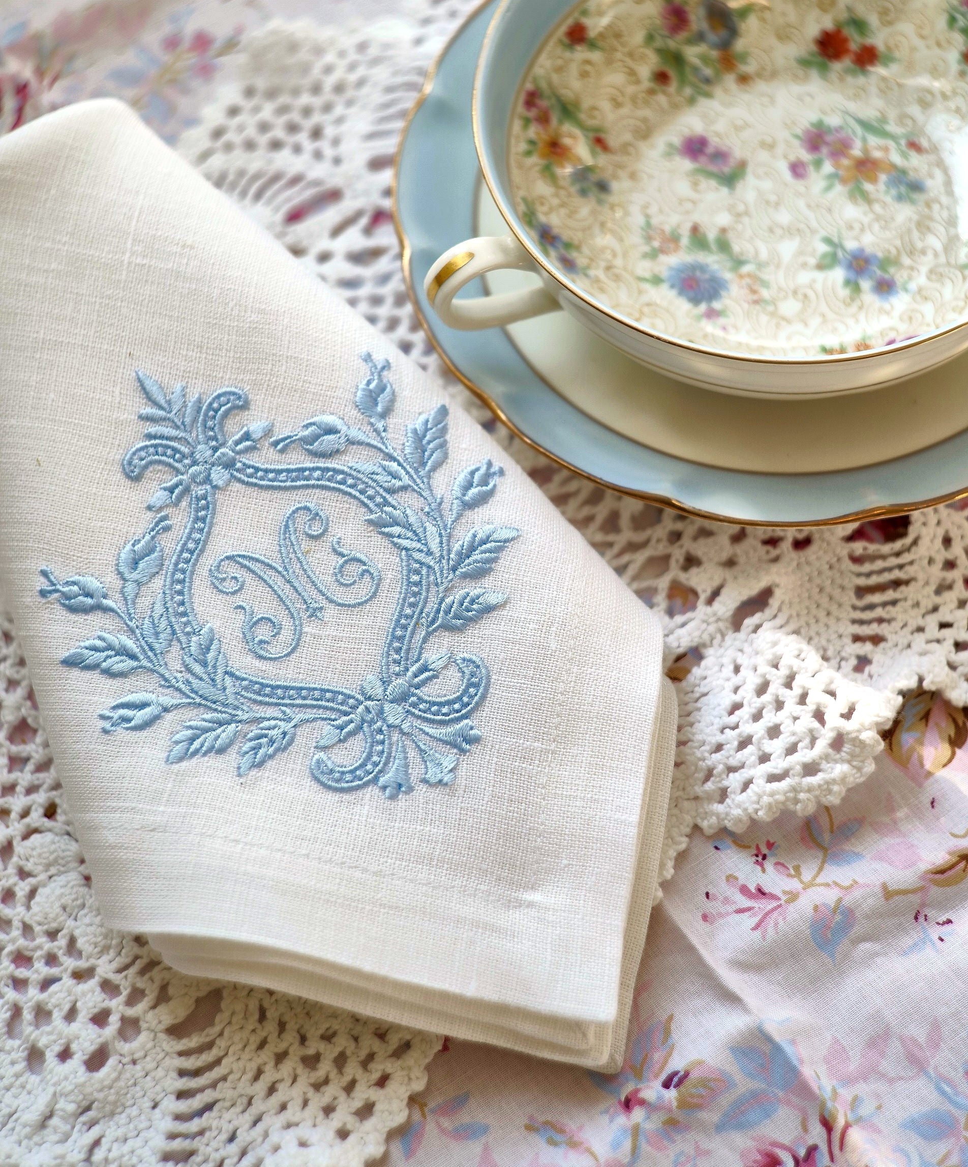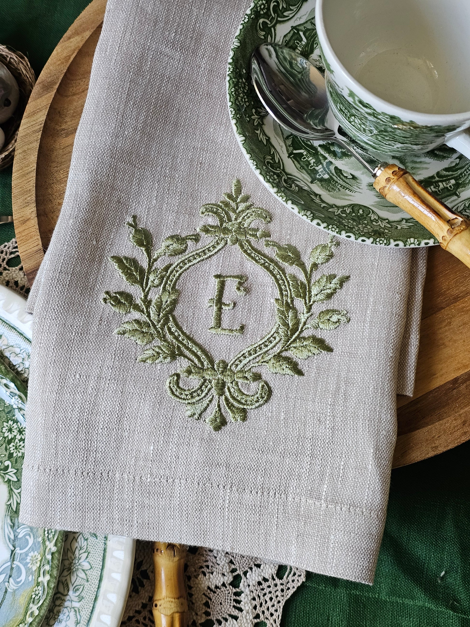 This graceful embroidery features a looping laurel crest tied with a bow, surrounding a central monogram in a classic serif style. The botanical frame and elegant symmetry evoke a timeless, heraldic charm that suits both modern and vintage tablescapes. Ideal for weddings, formal teas, or bespoke gifts, this linen accent brings refined personalization to any setting.