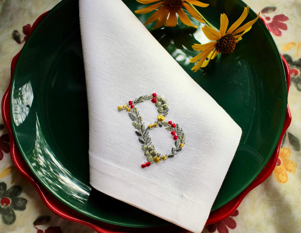 This embroidered monogram features a delicately curved letter formed entirely from leafy branches, bright red berries, and golden-yellow floral accents. With its natural, slightly rustic feel, the design evokes woodland charm and organic elegance. A lovely personalized touch for seasonal tables or year-round entertaining with botanical flair.