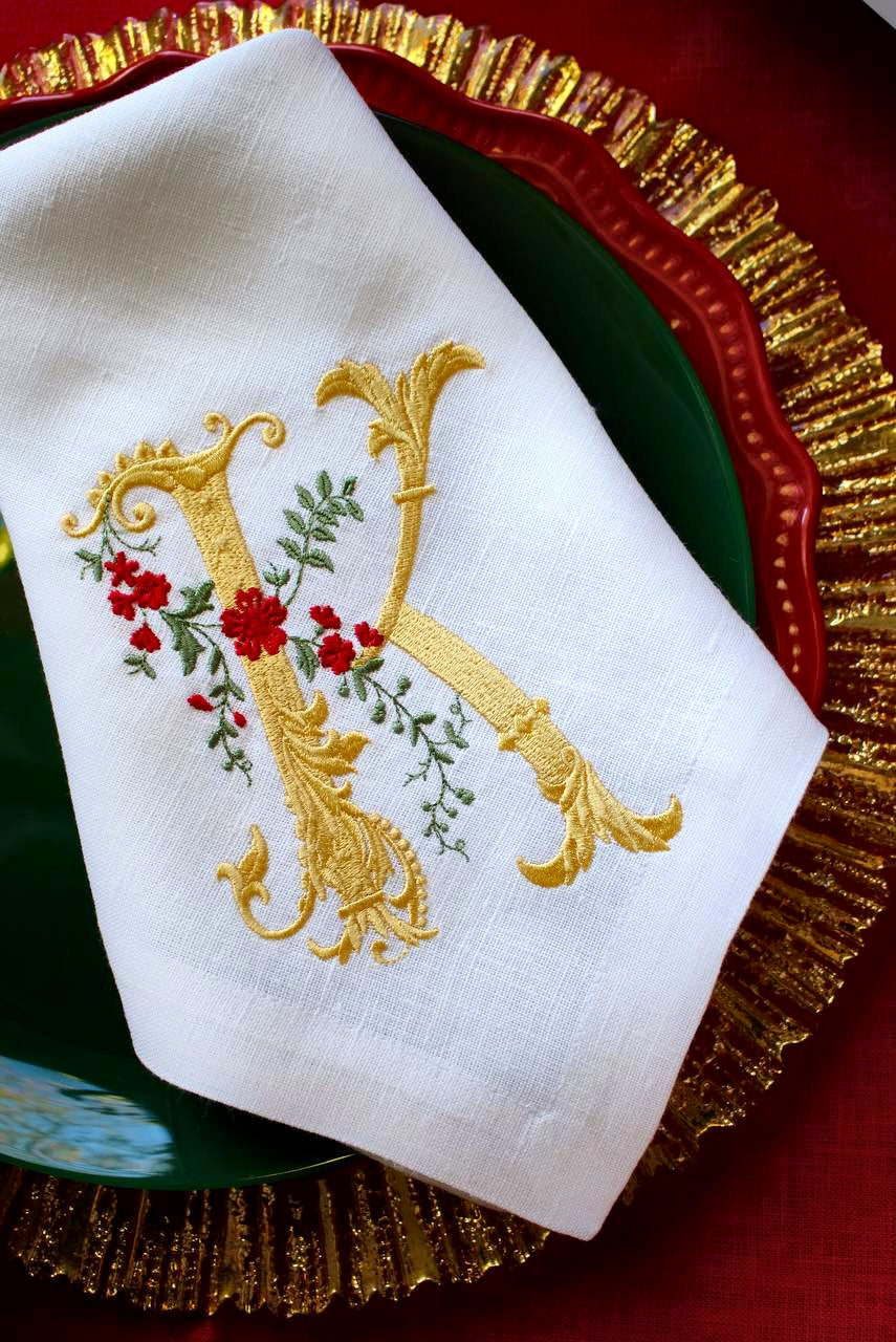 This opulent monogram features an ornate gold initial adorned with trailing green vines and vivid red blossoms. The design captures a luxurious baroque style, making it a standout accent for holiday tables or formal gatherings. With its rich detailing and festive color palette, it’s perfect for seasonal entertaining or elegant gifting.